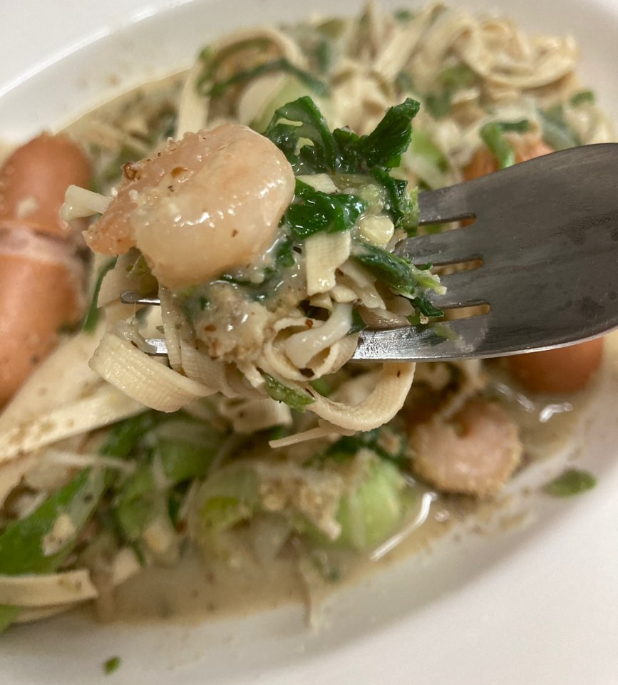 3. Saltear Todos los Ingredientes: Una vez lista la base aromática, agreguen el naegi preparado, los camarones, las vieiras, los champiñones y las salchichas de Viena a la sartén. Salteen todo junto hasta que los ingredientes estén cocidos de manera uniforme y ligeramente tiernos.