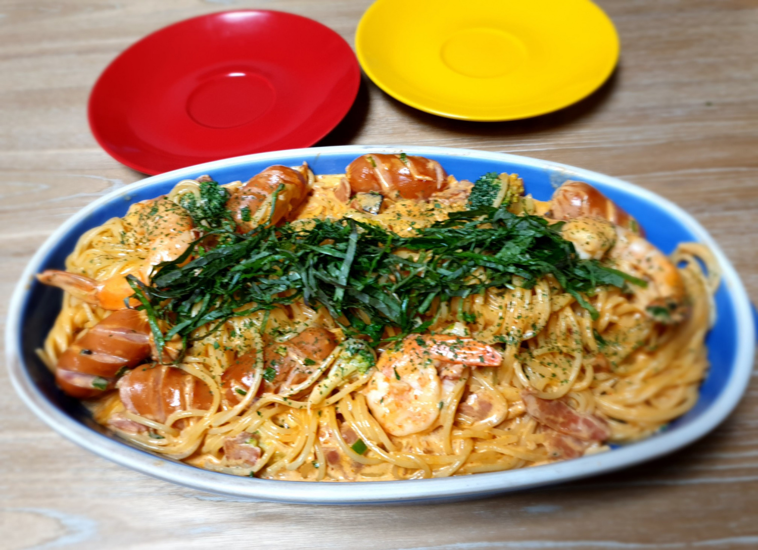 Transfiera la pasta Toowoomba terminada a un plato de servir bonito. Decore generosamente con hojas de perilla cortadas en juliana. ¡Su pasta Toowoomba picante y cremosa, perfectamente adaptada al paladar coreano, está ahora completa! El refrescante aroma de las hojas de perilla corta la riqueza, haciéndola increíblemente deliciosa. ¡Disfrute de su comida!
