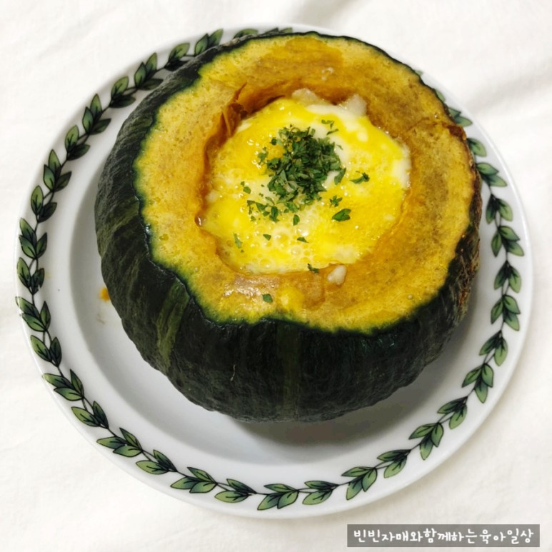 ¡Corta la calabaza por la mitad mientras esté caliente y observa cómo el delicioso queso se desborda junto con la sabrosa crema de huevo al vapor! A los niños les encanta este plato, ¡así que es una excelente opción para un refrigerio saludable y sabroso! ^^