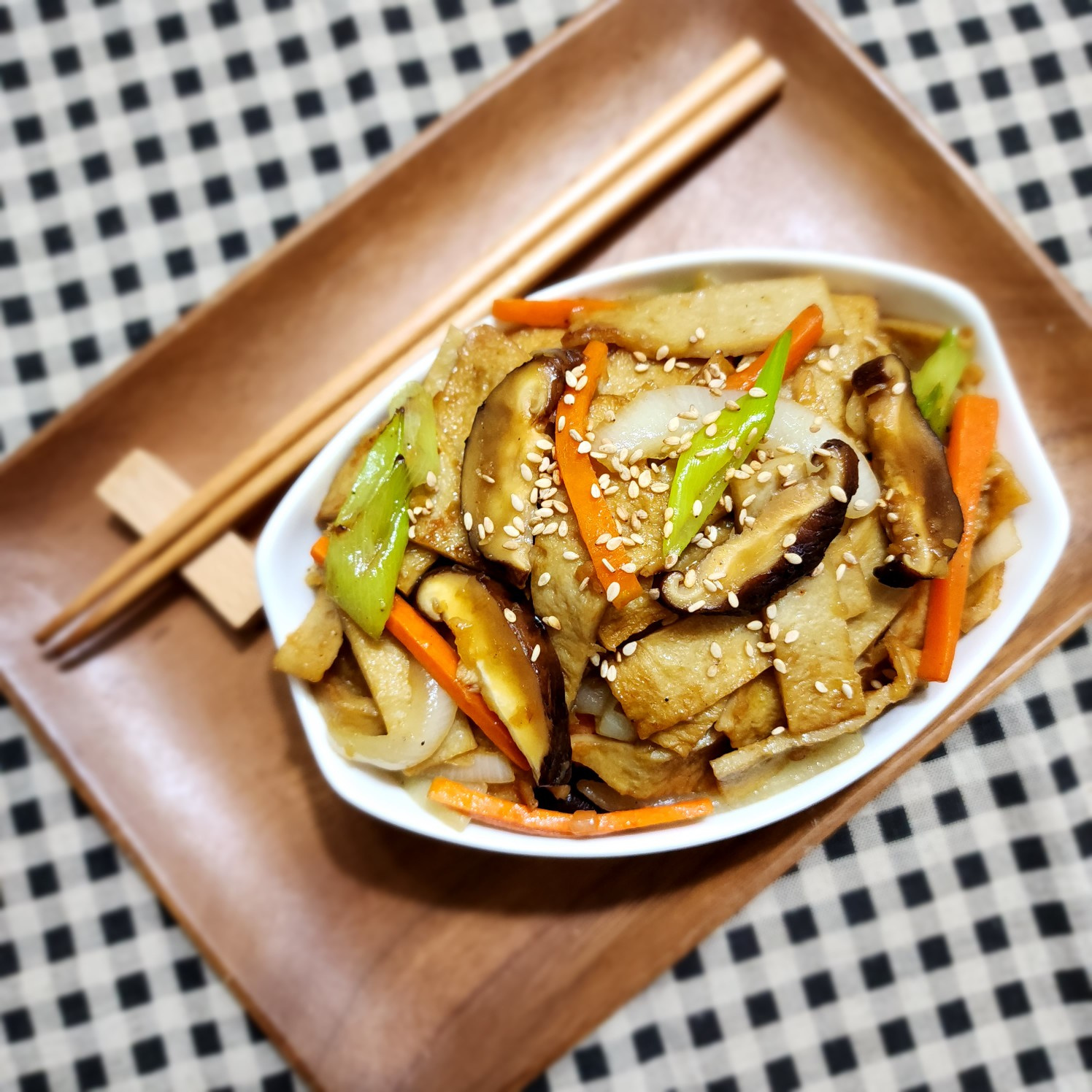 Cuando las verduras estén ligeramente ablandadas, agregue las cebolletas, los champiñones shiitake y los pastelitos de pescado escaldados. Saltee hasta que los ingredientes estén bien cubiertos de aceite y todo esté bien mezclado. Tenga cuidado de no cocinar en exceso los pastelitos de pescado, ya que pueden volverse duros.