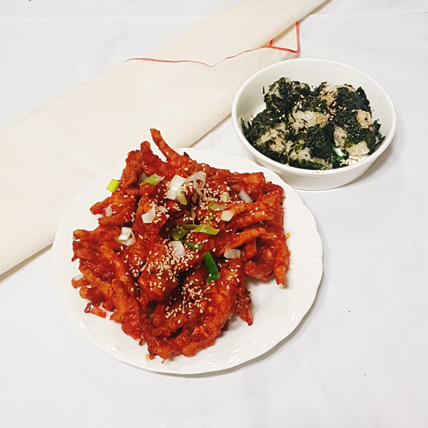 ¡Presentamos una deliciosa receta de patas de pollo salteadas, con una textura masticable y tierna, cubiertas con una salsa picante y dulce! Su sabor es tan cautivador que no podrás parar después del primer bocado. Hacen una combinación fantástica con bolas de arroz (onigiri ojukbap) y, gracias a su alto contenido de colágeno, también son beneficiosas para la piel, lo que hace que este plato sea aún más apreciado. La preparación es sorprendentemente sencilla, ¡así que anímense a prepararlo todos juntos!