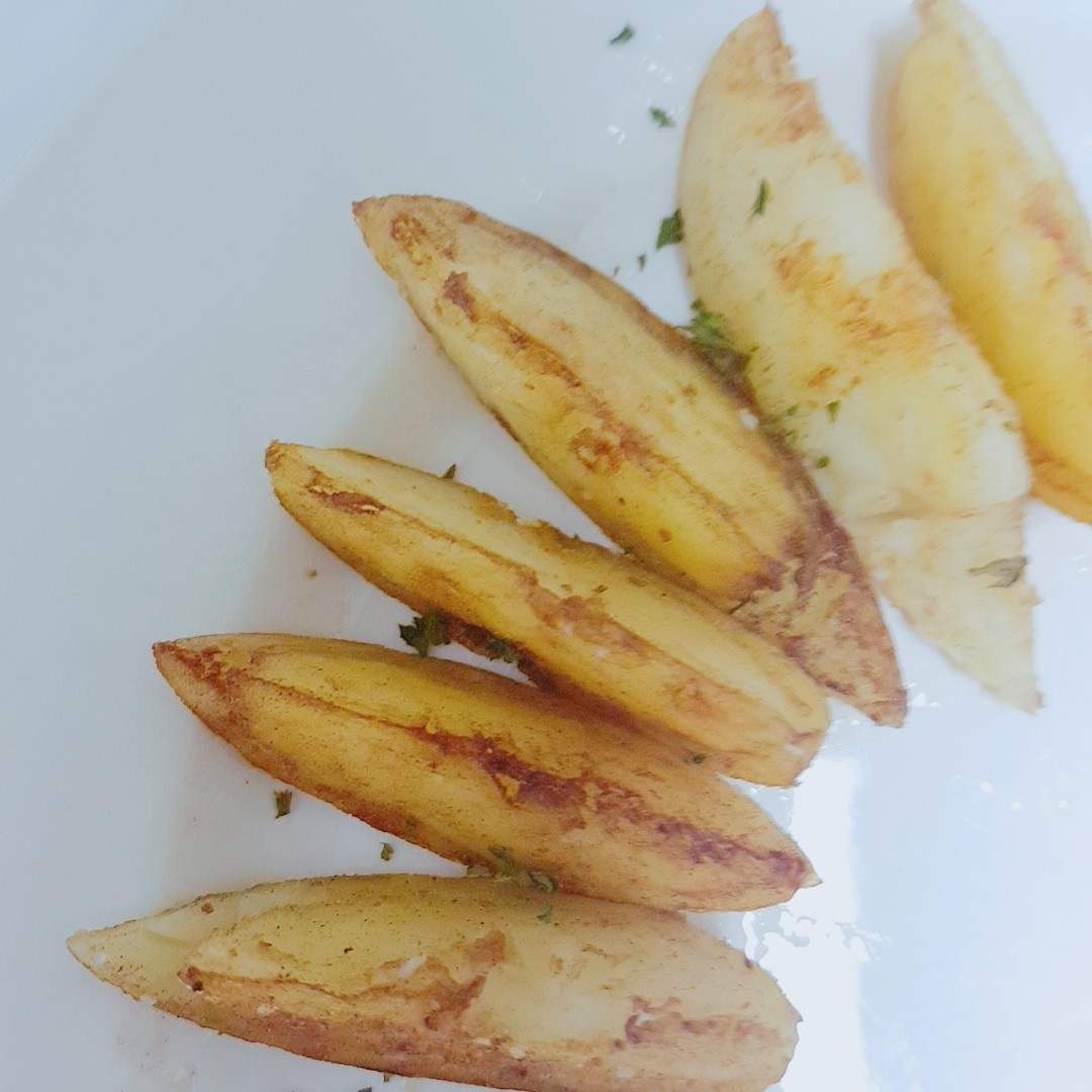 Finalmente, emplata tus patatas gajo doradas. Colócalas de forma atractiva junto a tu filete de lomo de cerdo para una presentación espectacular. Para darle un toque final de color y aroma, espolvorea una pizca de perejil seco por encima. ¡Tus deliciosas patatas gajo caseras están listas para disfrutar!