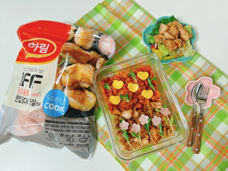 ¡Perfecto para una salida de primavera! Presentamos el ‘Chi-Bap Mitad y Mitad’, delicioso en casa pero aún más especial para picnics, junto con una ‘Ensalada de Pollo Balsámico’ para añadir un toque refrescante. Usando los tiernos y masticables muslos de pollo Hacendado de Sal Rosa IFF, disfrute de dos sabores a la vez: un chi-bap dulce y salado, y un chi-bap picante. Complete su menú de picnic con una vibrante ensalada de verduras frescas, muslos de pollo y un aderezo balsámico agridulce. ¡Agregue lindos recortes de jamón y queso con forma de pollito y flor de cerezo, junto con purslano fresco, para infundir su chi-bap con la esencia de la primavera y crear una comida verdaderamente especial!