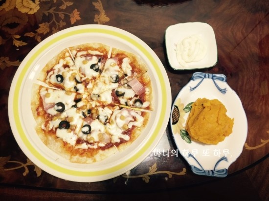 Primero, ¡prepara todos los ingredientes que harán tu pizza deliciosa! Siéntete libre de añadir cualquier topping que te guste en casa, además de los que se enumeran aquí, para crear tu pizza única. Yo he preparado maíz, tocino, pepperoni, champiñones y bulgogi dulce.