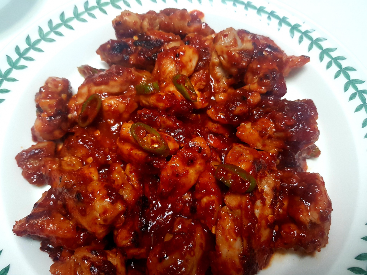 Una vez que el pollo esté parcialmente cocido, córtalo en trozos del tamaño de un bocado. Asegúrate de que esté bien cocido por dentro mientras mantienes un buen dorado exterior. Si te gustan los pasteles de arroz masticables (tteok), este es el momento perfecto para añadirlos a la sartén y saltearlos junto con el pollo.