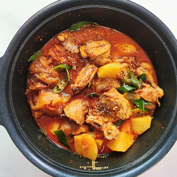 Este plato es una deliciosa variación del Dakbokkeumtang tradicional, enriquecido con el sabor profundo y ligeramente ácido del kimchi añejo o fermentado. La cocción lenta permite que los sabores se mezclen, resultando en un estofado tierno y lleno de sabor, perfecto para acompañar con arroz. ¡El caldo resultante es ideal para mezclar con arroz y disfrutar al máximo! (Las medidas de las cucharas se refieren a cucharas de arroz coreanas estándar)