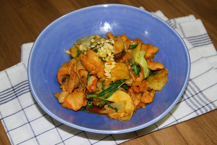 Si utilizas una salsa comercial para pollo salteado, se recomienda enjuagarla brevemente bajo agua corriente para moderar el nivel de picante. Si prefieres que esté más picante, siéntete libre de usarla directamente. (¡Ajusta según tu preferencia!)