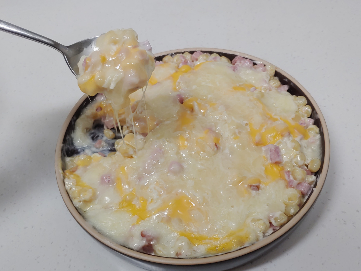 Coloca el queso de jamón y maíz preparado en el microondas y calienta durante aproximadamente 2 minutos y 10 segundos a 2 minutos y 30 segundos. Estará listo cuando el queso esté completamente derretido y todo esté bien caliente. ¡Disfrútalo inmediatamente mientras el queso está deliciosamente fundido y elástico!