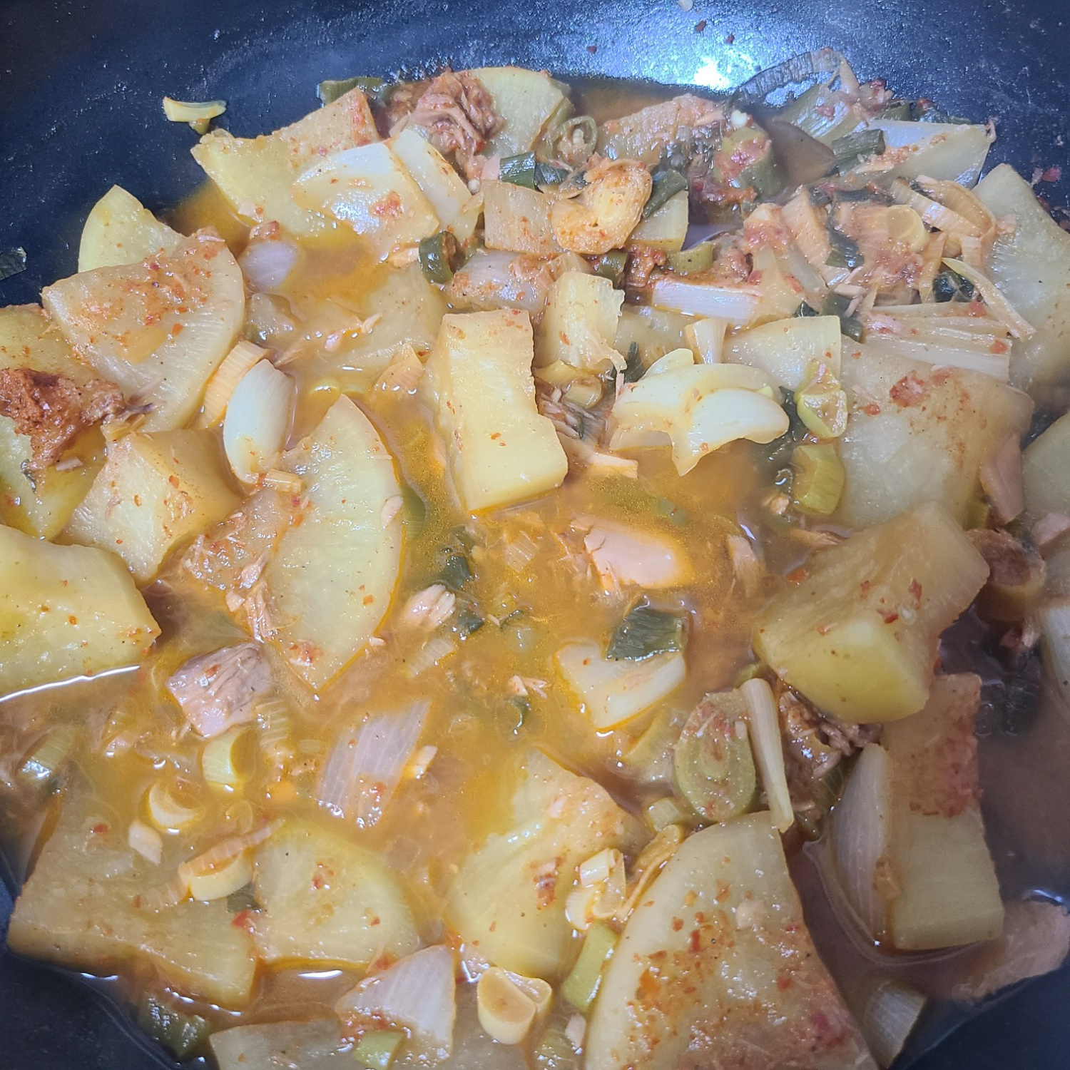 Una vez que el rábano haya absorbido el aderezo durante unos 5 minutos, agrega el atún en lata (con el aceite reservado) y la cebolla, la cebolleta y los chiles verdes coreanos cortados. Tapa la olla, reduce el fuego a medio-bajo y deja cocinar a fuego lento durante otros 15 minutos. Cocinar a fuego medio-bajo permite que los ingredientes se cocinen sin quemarse y asegura que los sabores se distribuyan uniformemente. Puedes rociar periódicamente un poco del líquido de cocción sobre los ingredientes mientras se cocina. ¡Sirve caliente sobre un tazón de arroz al vapor. ¡Disfruta!