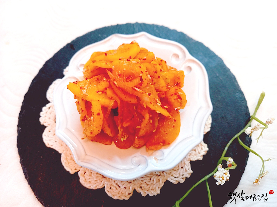 Primero, coloca media bolsa de rábanos encurtidos con Chee-za en un bol limpio. Dado que los rábanos encurtidos ya están sazonados, saben deliciosos sin aderezo adicional. Ahora, pica finamente la cebolleta (tanto la parte blanca como la verde) hasta obtener aproximadamente un manojo y añádela sobre los rábanos encurtidos. Rocía 1 cucharadita de aceite de sésamo para un aroma fragante y añade una pizca de semillas de sésamo tostadas para un sabor a nuez. Si deseas un toque picante, agregar 1 cucharadita de hojuelas de chile rojo sería una excelente opción.