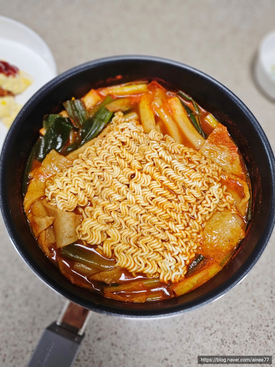 Una vez que los pasteles de arroz estén hinchados y bien cocidos, añade finalmente los fideos Jin Ramen. Cocina por otros 3 minutos. Ten cuidado con el tiempo de cocción para evitar que los fideos se deshagan. ¡Tu delicioso rabokki está listo para ser disfrutado!