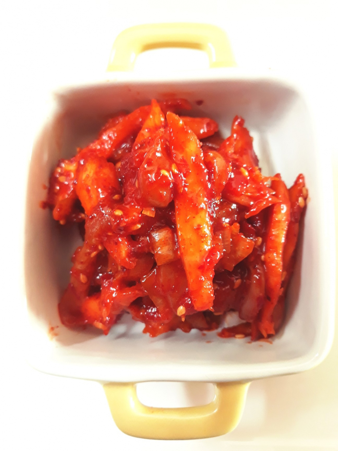 - 1 taza de calamares salados comprados en tienda (ojingeojeotgal)