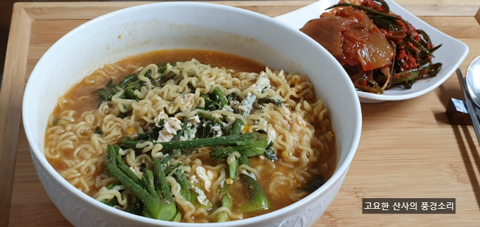 Ahora, vamos a cocinar el ramen. Vierte 600 ml de agua (aproximadamente 3 tazas de té estándar coreano) en una olla y llévala a ebullición fuerte a fuego alto. Una vez que el agua esté hirviendo vigorosamente, agrega la base de sopa y el paquete de verduras secas que venían con tu ramen, seguido de los fideos de ramen. A continuación, añade los brotes de Aralia preparados. Mientras el ramen se cocina con el dureup, un aroma maravilloso y fresco llenará tu cocina, profundizando las notas saladas del ramen.