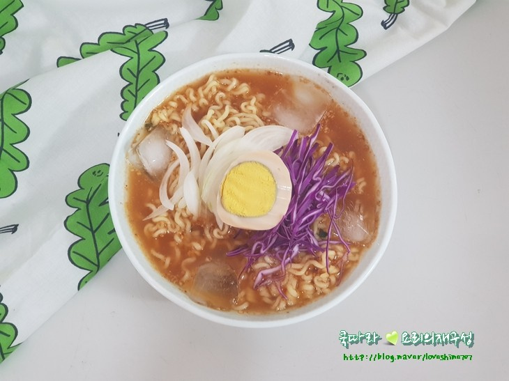 Finalmente, decora tu ramen frío con el repollo morado y la cebolla cortados en juliana fina, y el huevo cortado. ¡Disfruta de tu deliciosa y refrescante comida de verano! Es el mejor capricho para un día caluroso.