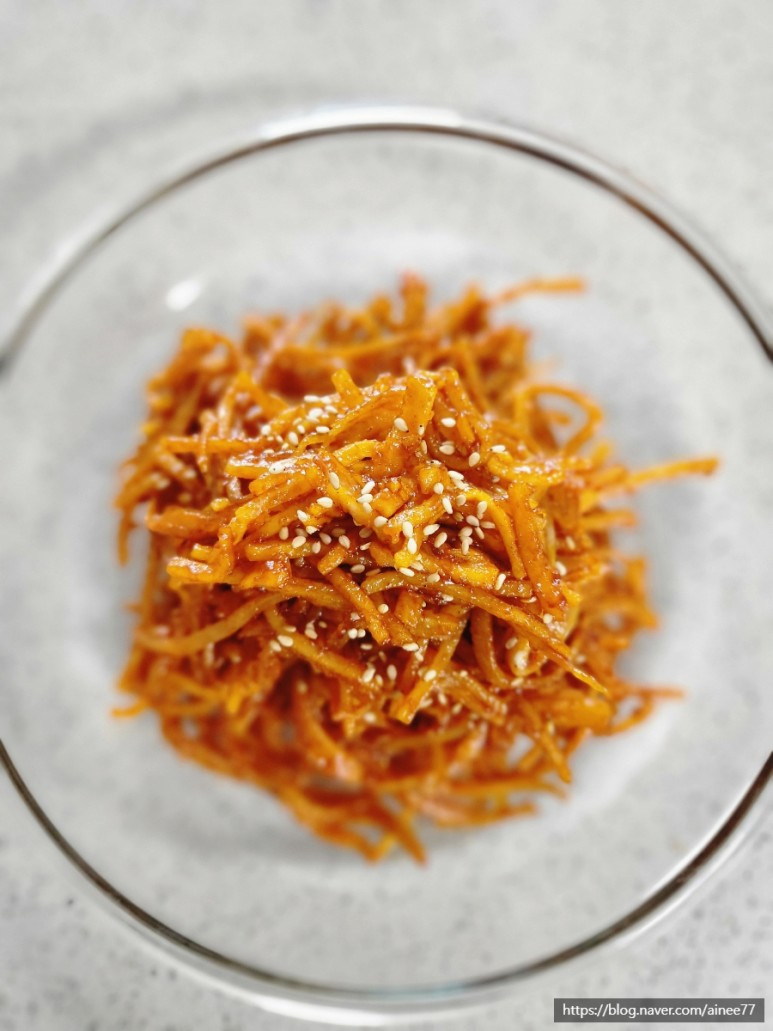 ¡Este es el acompañamiento más vendido en las tiendas de ‘banchan’! ¡Intenta hacer este popular acompañamiento fácilmente en casa! Es masticable pero tierno, con una salsa agridulce que es perfecta con arroz. También es excelente como merienda para niños o como guarnición para la fiambrera.