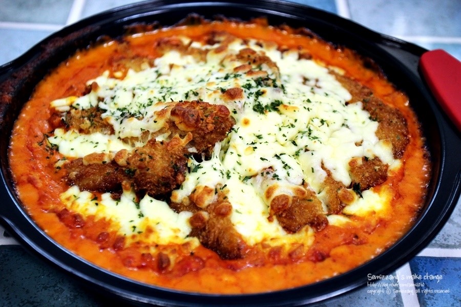 Ahora, realzaremos el sabor de nuestra salsa rosé. Añada 1 cucharada de curry en polvo y bata hasta que esté bien incorporado y suave, asegurándose de que no queden grumos. El curry en polvo impartirá un aroma sutil pero intrigante. Extienda la salsa rosé preparada uniformemente en una fuente apta para horno o una cazuela para gratinar. Corte los filetes de cerdo fritos en trozos pequeños (aproximadamente 2-3 cm) y colóquelos de manera atractiva sobre la salsa rosé.