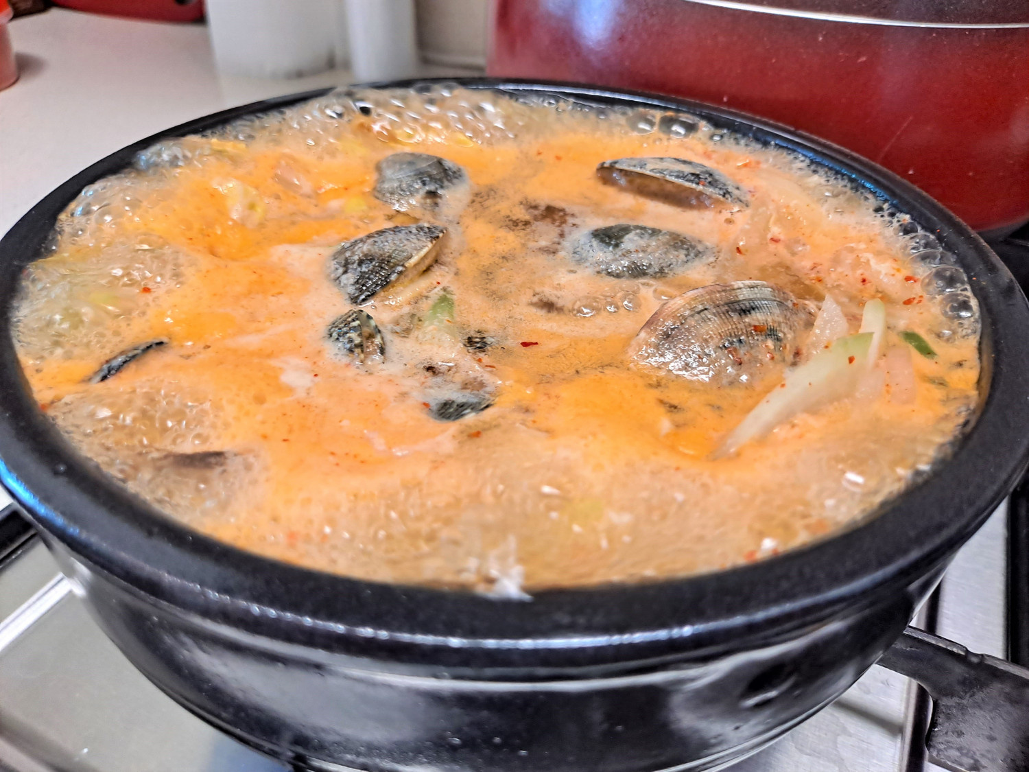 Finalmente, agregue las almejas purgadas y cocine a fuego lento un poco más. Una vez que las almejas comiencen a abrirse, apague el fuego y traslade el ttukbaegi a la mesa. El calor residual cocinará perfectamente las almejas, profundizando el sabor del caldo.
