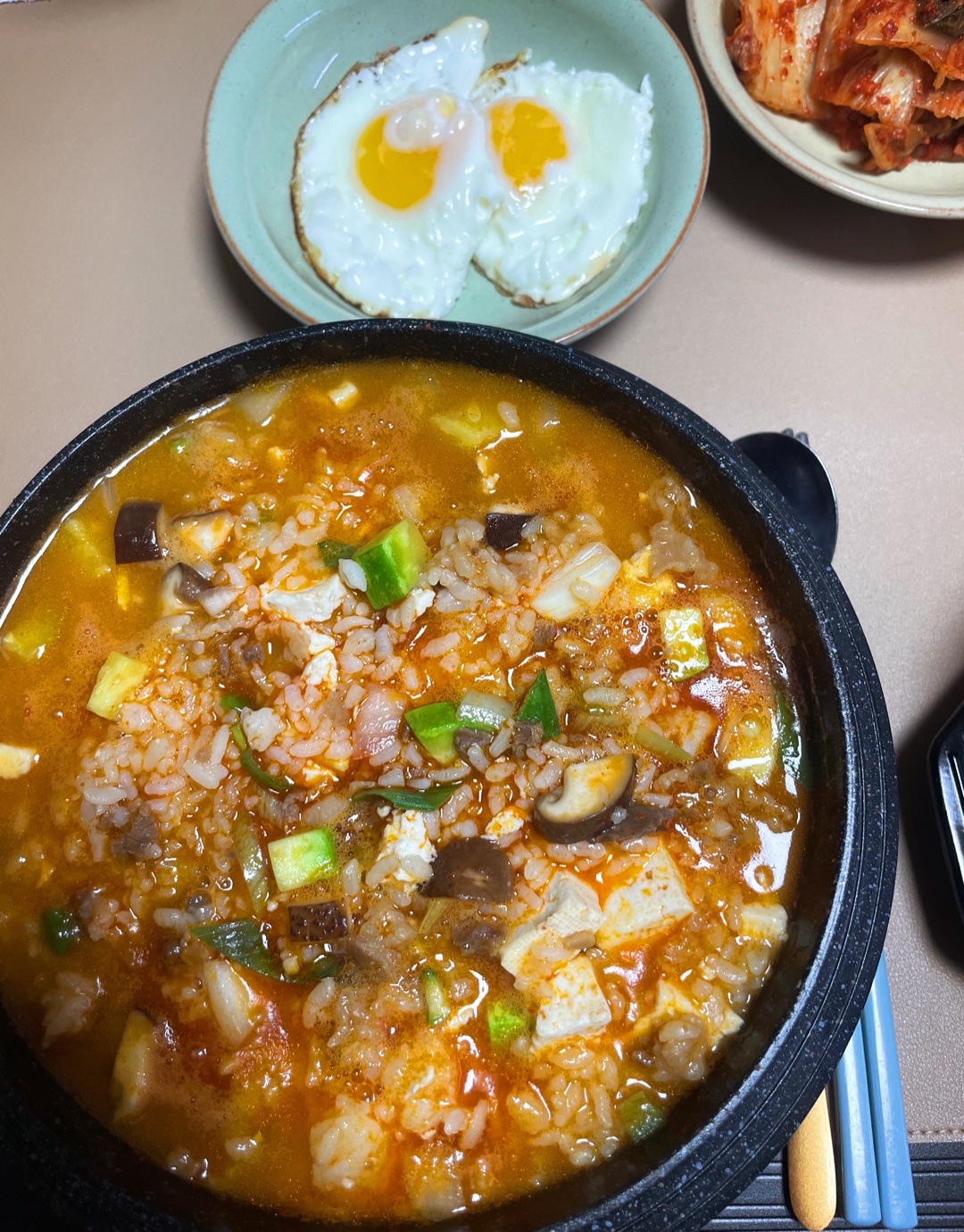 ¡Mezcla todo y deja que hierva a fuego lento unos minutos más para que todos los sabores se mezclen maravillosamente! Ten cuidado de no añadir demasiado arroz al principio, ya que puede hacer que la sopa quede demasiado espesa y difícil de manejar. ¡Disfruta de tu delicioso y reconfortante Doenjang-Soolbap casero!