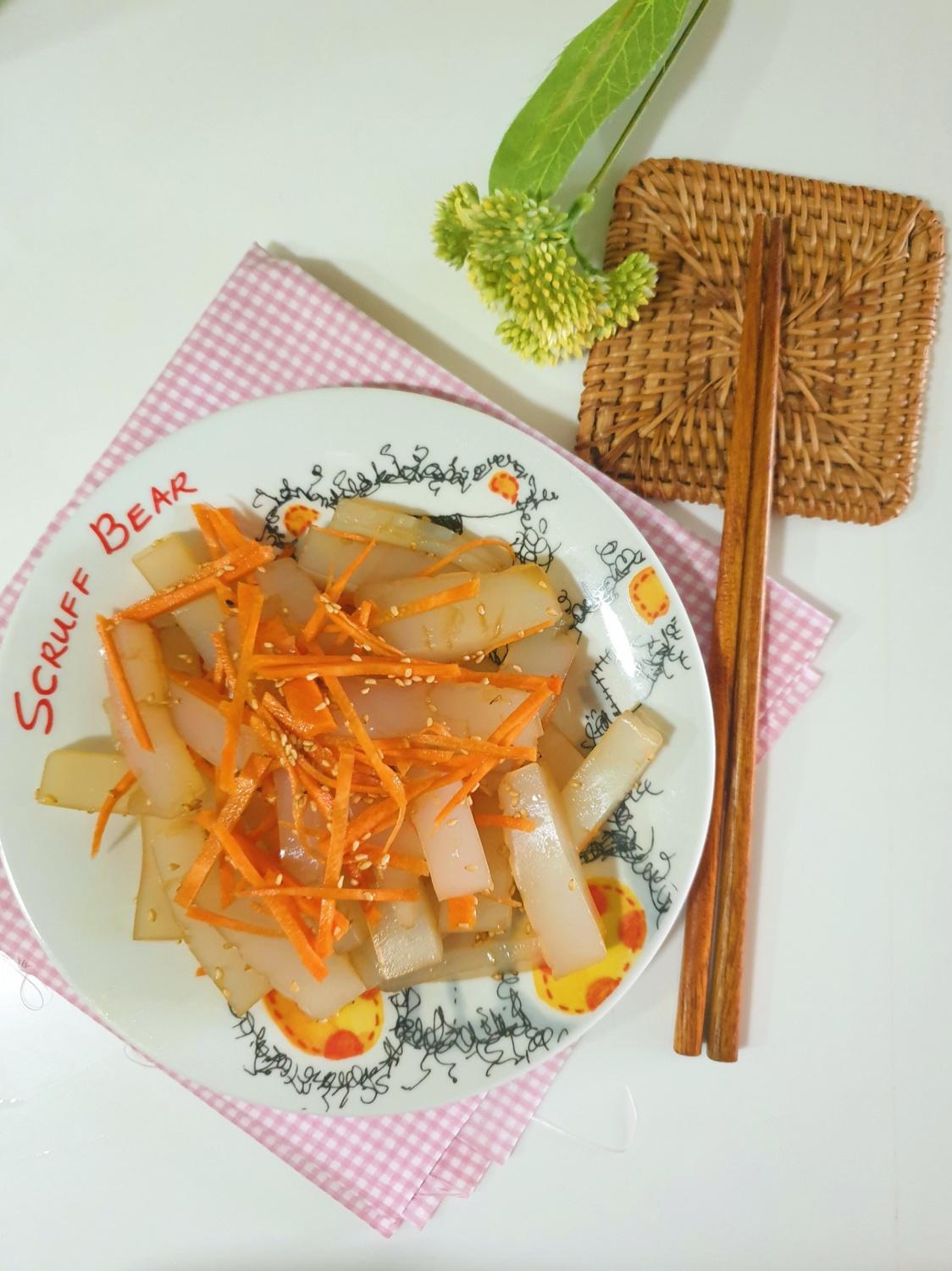 Corta la zanahoria en juliana fina. En un bol grande, combina el cheongpomuk escurrido y las zanahorias en juliana. Agrega la salsa de soja, el aceite de perilla y las semillas de sésamo. Mezcla suavemente todo hasta que esté bien combinado. ¡Tu deliciosa ensalada de cheongpomuk está lista! ¡Disfruta de su maravilloso y sabroso sabor.