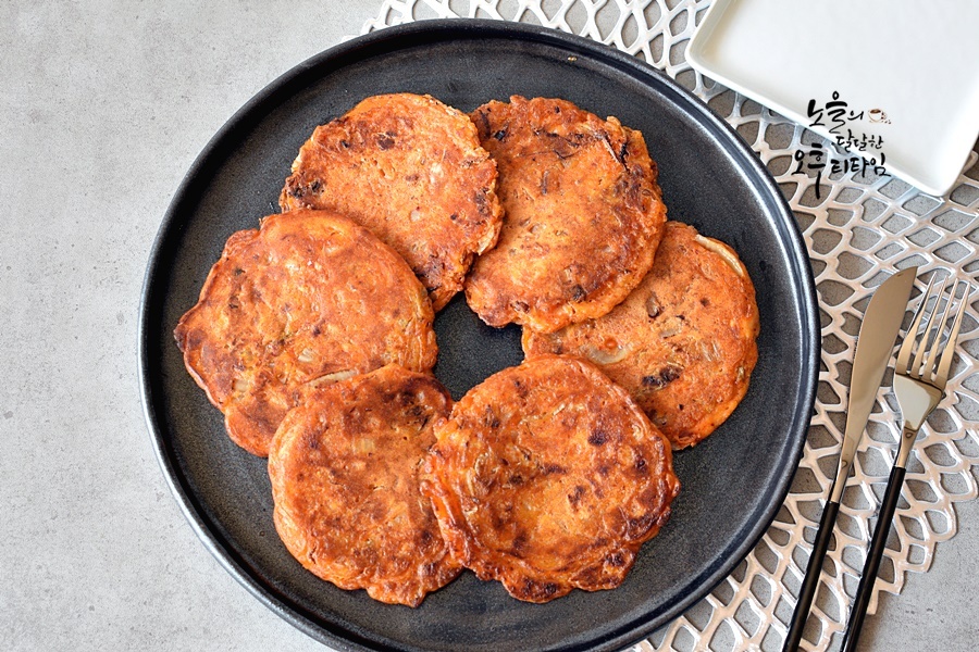 Estaba pensando qué hacer para el almuerzo del fin de semana y decidí preparar kimchi pancake, un favorito de mi hija. Queriendo una tortilla de kimchi excepcionalmente deliciosa, busqué la receta de Baek Jong-won de ‘House Food Master’ y la preparé. ¡Las recetas de Baek Jong-won siempre son fiables! Esta tortilla de kimchi, con sus bordes crujientes y su vibrante color rojo realzado por el gochugaru, es lo que yo llamaría una receta dorada. Añadir salmón en lata la hace aún más especial.