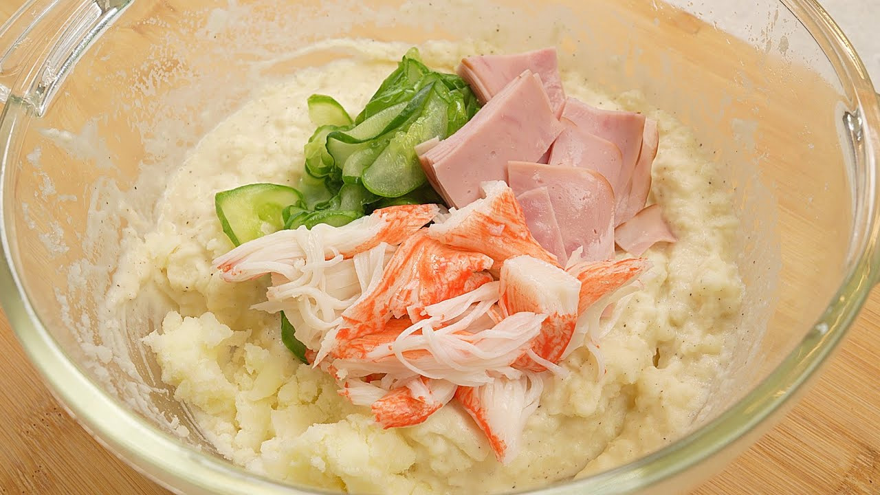 Finalmente, exprime el exceso de agua de las rodajas de pepino saladas. Añade el pepino escurrido a la mezcla de papa. Desmenuza las barritas de surimi y corta el jamón en cubitos, luego añádelos también al tazón. Mezcla suavemente todos los ingredientes con la base de papa hasta que todo esté bien combinado. ¡Tu deliciosa ensalada de papa está lista para servir!
