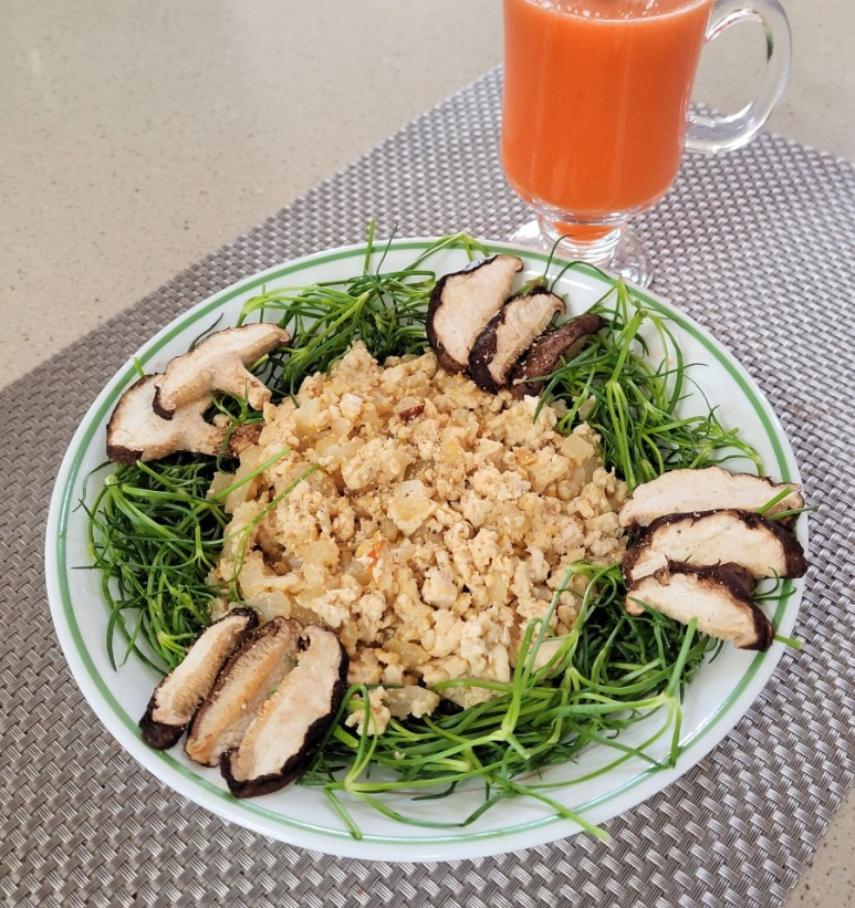 Comida Nutritiva: Shiitake a la Parrilla y Revuelto de Tofu y Huevo con Verdolaga Marina, Más Jugo de Zanahoria Cocida al Vapor