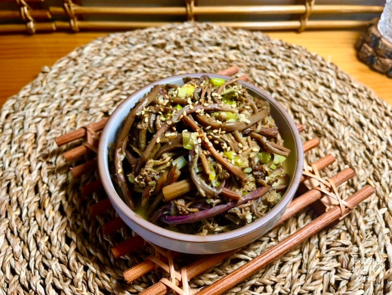 Finalmente, añade las cebolletas picadas (3 cucharadas) y 1.5-2 cucharadas de aceite de sésamo. Dale un salteado rápido para añadir un aroma a nuez. Para un sabor aún más rico y a nuez, también puedes añadir 1-2 cucharadas de polvo de semillas de perilla. El Gosari, ablandado a través de un remojo y hervido exhaustivos, se combina ahora con un delicioso aderezo para crear un excelente plato de acompañamiento. El Gosari Namul, conocido como ‘carne de montaña’ por sus ricos nutrientes, es delicioso por sí solo, pero también es increíblemente sabroso mezclado con una cucharada de gochujang sobre arroz. Para las próximas vacaciones de Chuseok, un plato representativo, ¡prueba a hacer este Namul saludable y delicioso con esta receta, donde solo necesitas hervir el Gosari hasta que esté tierno y aderezarlo con ingredientes sencillos!