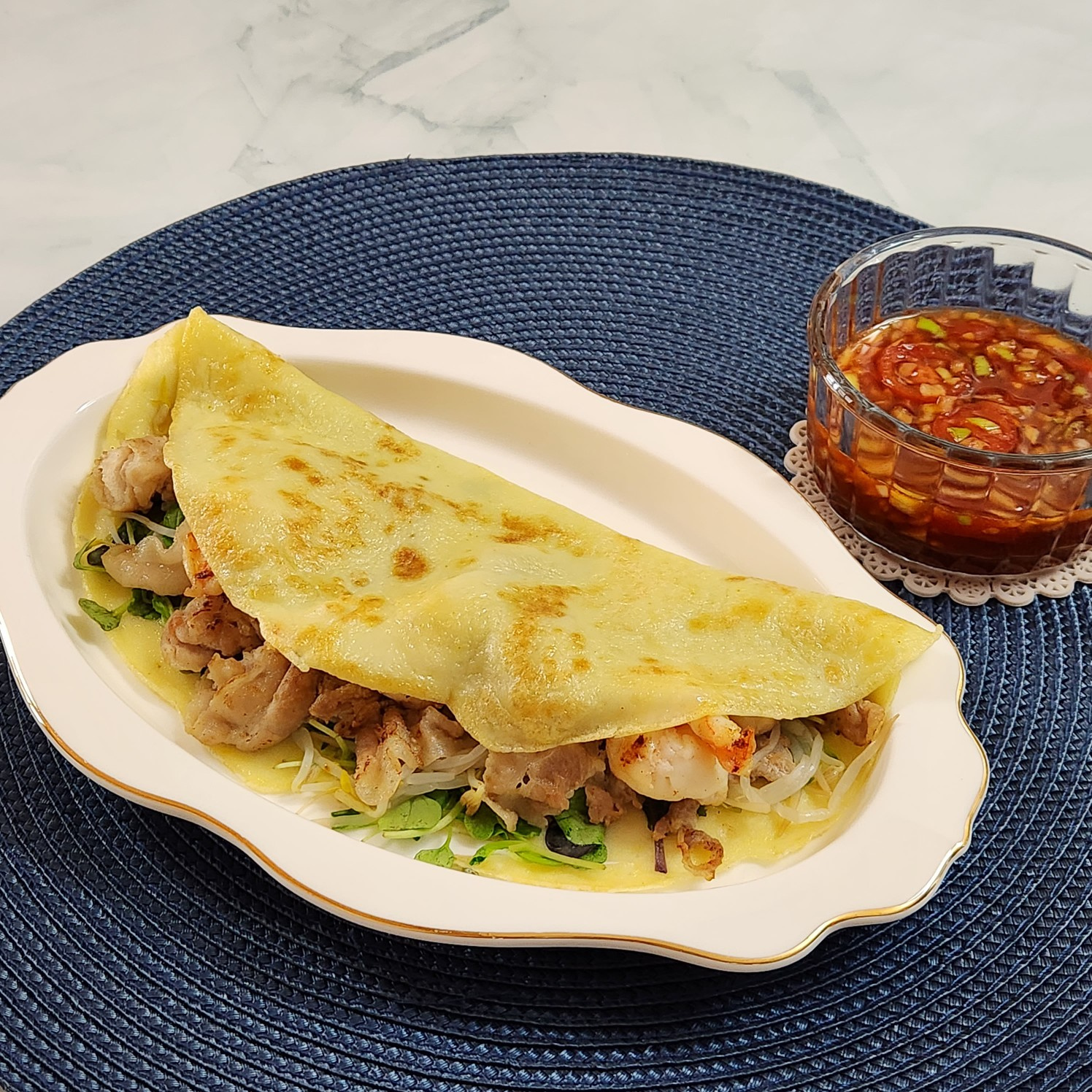 ¡Preparemos delicioso Banh Xeo, un plato representativo de la comida callejera y casera de Vietnam, aquí mismo en casa! Esta fina y crujiente crepe se rellena generosamente con brotes de soja frescos, verduras crujientes, cerdo sabroso y camarones jugosos, ofreciendo tanto nutrición como sabor. Rociada con nuestra salsa especial Nuoc Cham, los auténticos sabores vietnamitas se realzarán.
