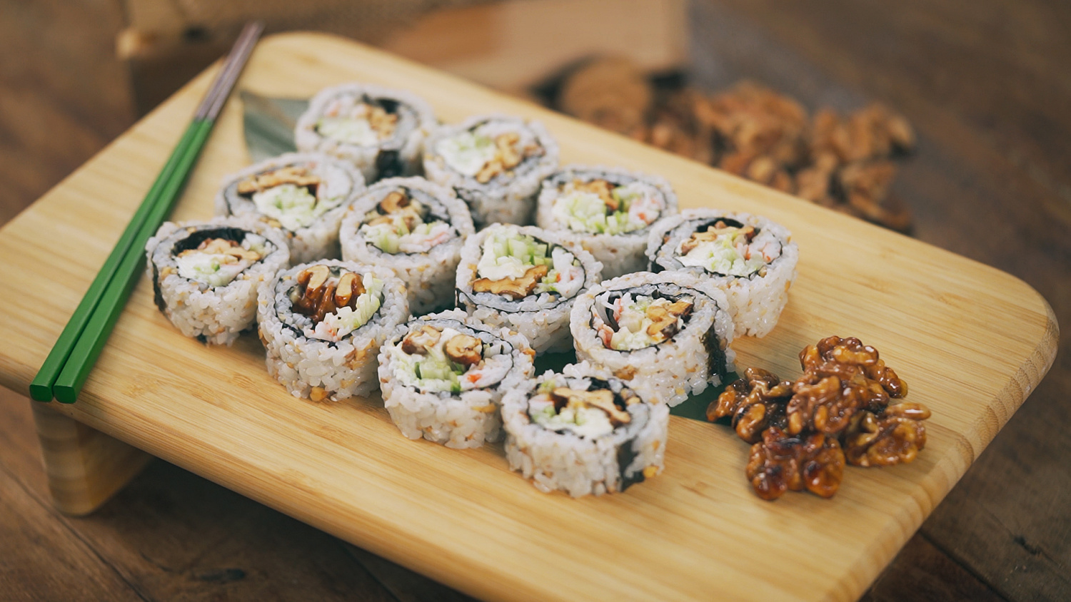 Una vez enrollados firmemente, corta los Rollos de Queso Crema con Nueces en trozos del tamaño de un bocado. Mojar el cuchillo en agua antes de cortar puede ayudar a evitar que el arroz se pegue a la hoja, logrando cortes más limpios. Disfruta los rollos tal cual, o sírvelos con salsa de soja o mayonesa según tu preferencia.