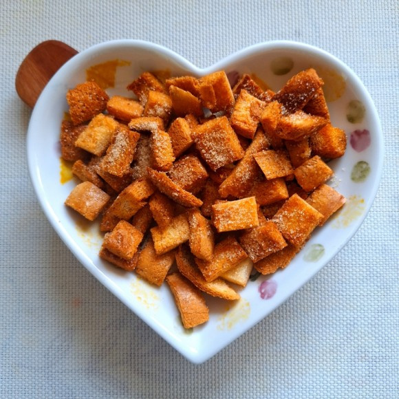 Rocíe generosamente los trozos de bordes de pan cortados con spray de aceite. Si no tiene spray de aceite, también puede pincelarlos con mantequilla derretida (aproximadamente 1-2 cucharadas). Cubrirlos con aceite o mantequilla hará que las rosquillas queden extra crujientes y sabrosas.