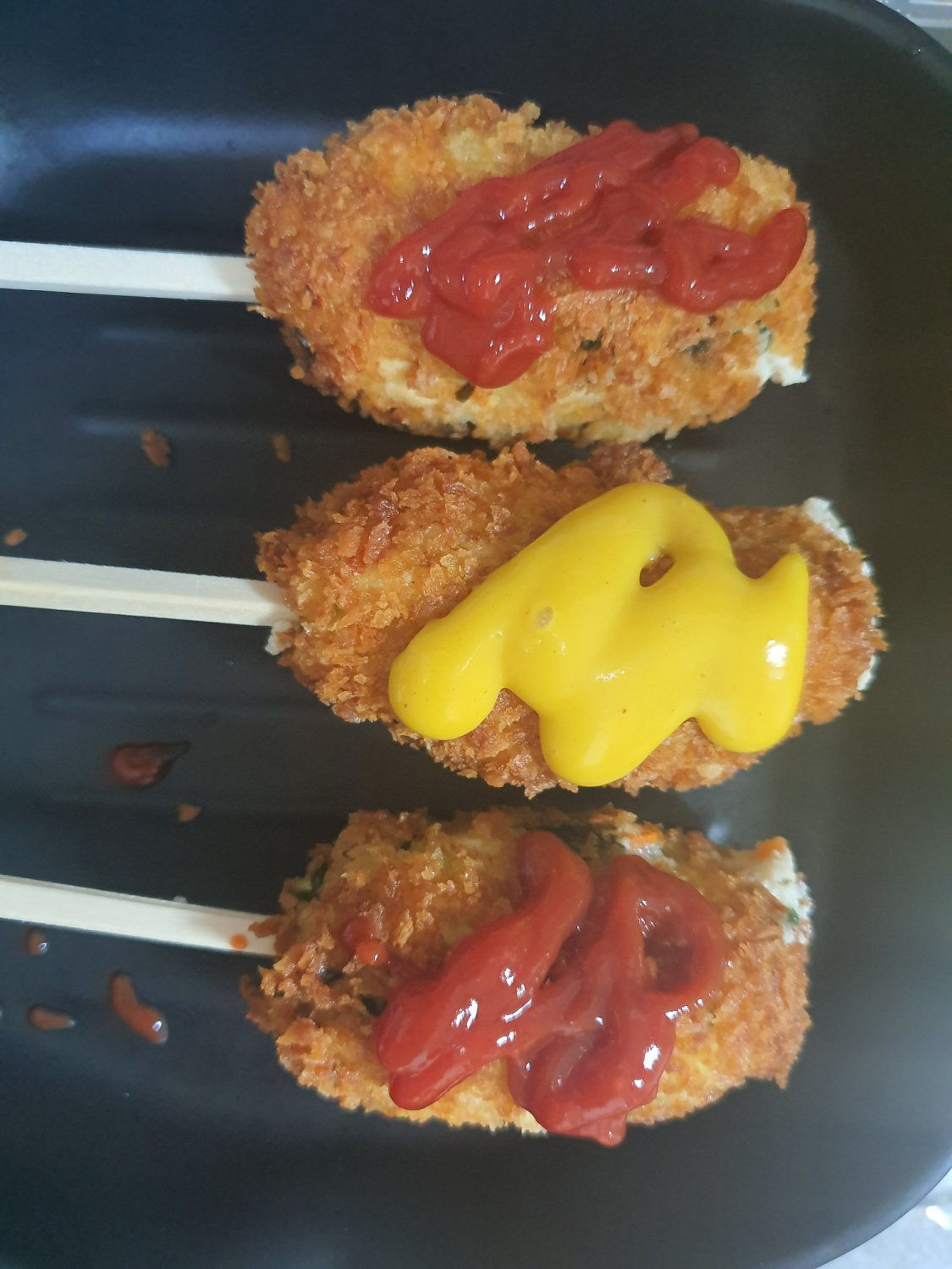 Tradicionalmente, las salchichas de tofu se hacen insertando un palillo en la salchicha y luego envolviéndola con la mezcla de tofu. Sin embargo, para freírlas más fácilmente, puedes omitir el palillo y simplemente dar forma a la mezcla de tofu en bolas o cilindros alrededor de las salchichas. (Si usas palillos, insértalos ahora en las salchichas).