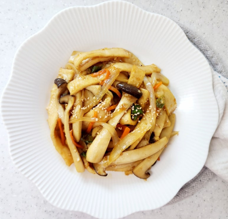 Una vez que las setas ostra rey estén doradas, añade la zanahoria y la cebolla en juliana a la sartén. Saltea hasta que las verduras estén ligeramente tiernas y las cebollas se vuelvan translúcidas. Luego, añade los pasteles de pescado escurridos y saltea hasta que estén ligeramente dorados y cubiertos con los demás ingredientes. Los pasteles de pescado ligeramente salteados añaden una textura elástica.