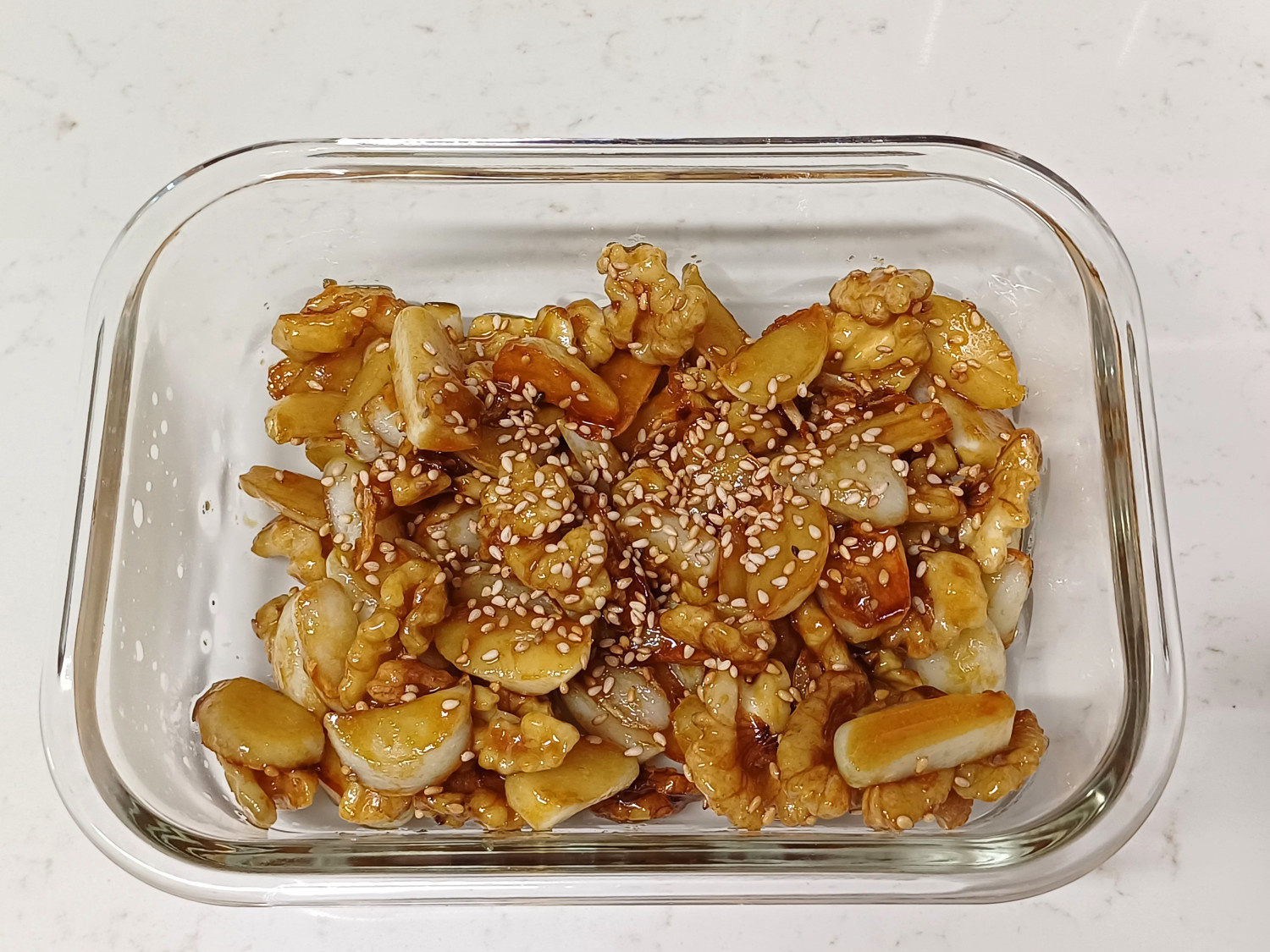 Una vez que la salsa se haya reducido y los ingredientes estén bien glaseados, apaga el fuego. Espolvorea 1 cucharada de semillas de sésamo tostadas por encima para un aroma extra a nuez y mezcla suavemente. ¡Tu delicioso Salteado de Ajo y Nueces está listo! Está buenísimo servido caliente, pero la textura se vuelve aún más masticable y a nuez al enfriarse.