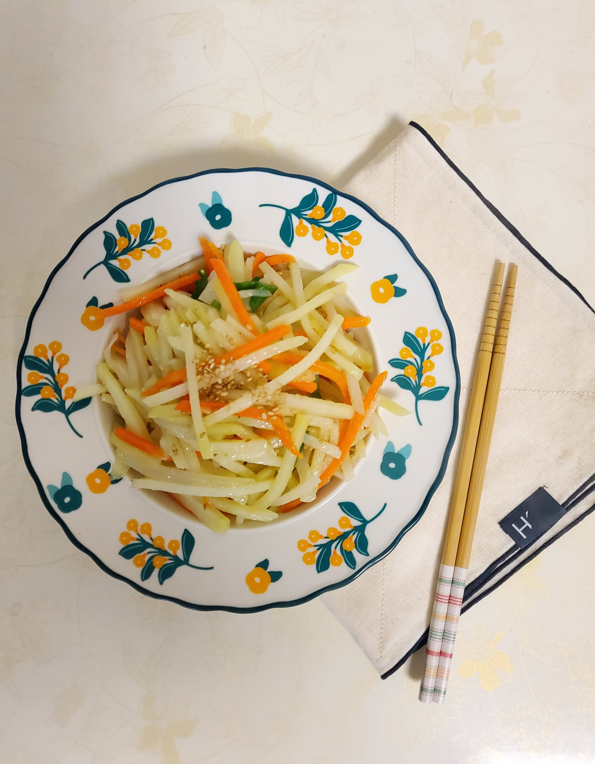 ¡Bienvenidos! Hoy les compartiré la receta de ‘Gamjachae Bokkeum’ (Salteado de Patatas en Juliana), un plato de acompañamiento coreano que gusta a todo el mundo. ¡Hagamos su mesa aún más abundante con este salteado sencillo pero delicioso!
