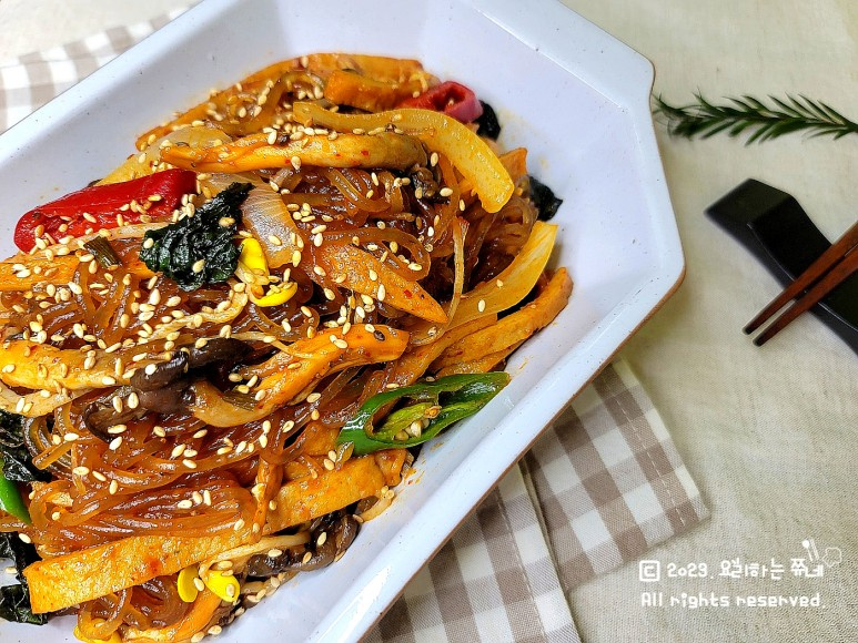 Salteado Crujiente y Picante de Brotes de Soja y Fideos de Cristal (Japchae de una Sola Sartén)