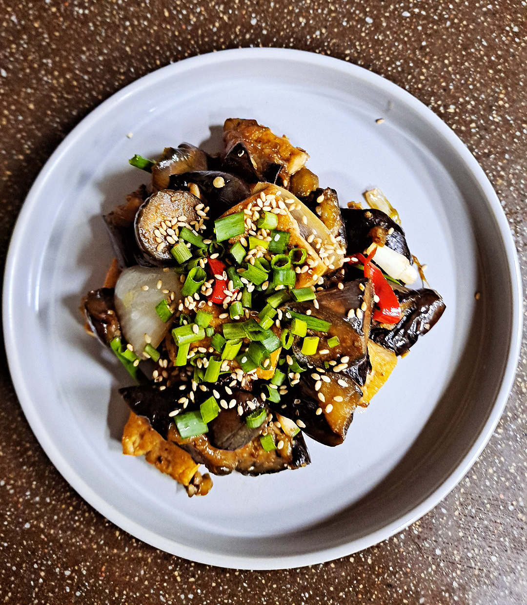 Transfiere el salteado terminado a un plato para servir. Antes de servir, espolvorea con cebolleta picada y semillas de sésamo tostadas para un acabado aromático y a nuez. La combinación de berenjena, rica en fibra dietética, y tofu, repleto de proteínas, lo convierte en una excelente opción para una comida saludable o incluso una opción para quienes cuidan su dieta. ¡Disfruta de la deliciosa armonía de la berenjena y el tofu, bellamente infundidos con una sabrosa salsa a base de soja!