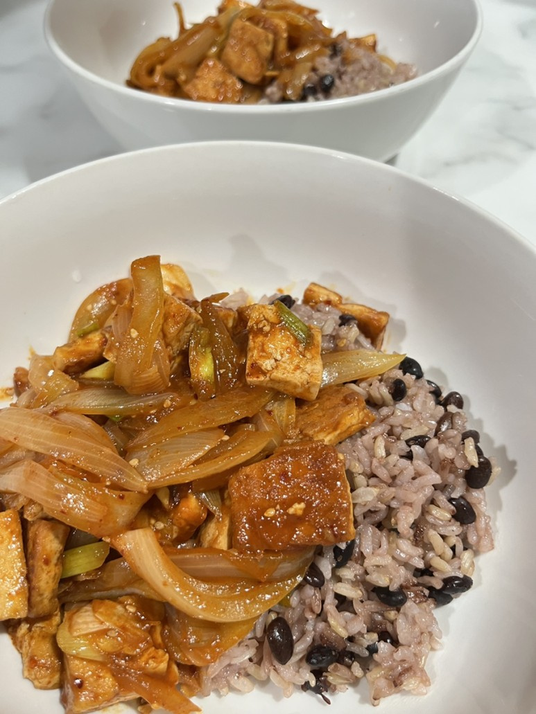 Las cebollas dulces, el tofu masticable y la salsa perfectamente equilibrada picante, dulce y salada crean una cobertura irresistible para el arroz, convirtiéndolo en una comida completa maravillosamente satisfactoria. Cada grano de arroz quedará cubierto con la deliciosa salsa.