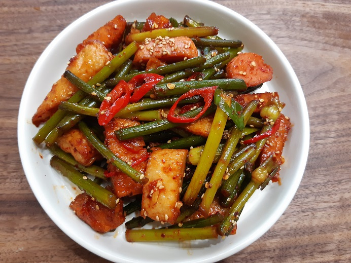 Salteado de Pastel de Pescado y Ajos Tiernos