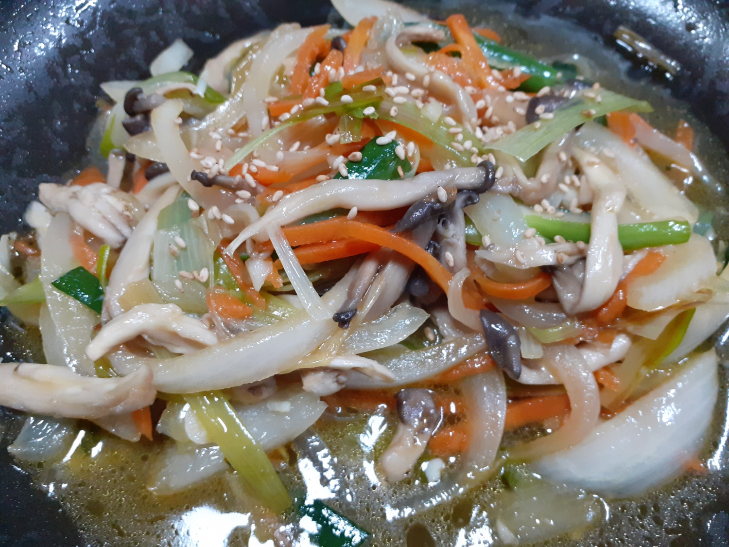 Una vez que todo esté bien combinado y cocido, apaga el fuego. Rocía con 1 cucharada de aceite de sésamo para un acabado aromático. Añadir el aceite de sésamo después de apagar el fuego preserva su aroma.
