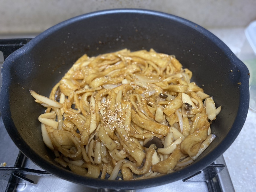 Calienta una sartén a fuego medio y añade un poco de aceite de cocina. Agrega el pastel de pescado cortado en juliana y saltea hasta que se ablande ligeramente. Saltear primero el pastel de pescado ayuda a eliminar el exceso de grasa y le da una textura más masticable.