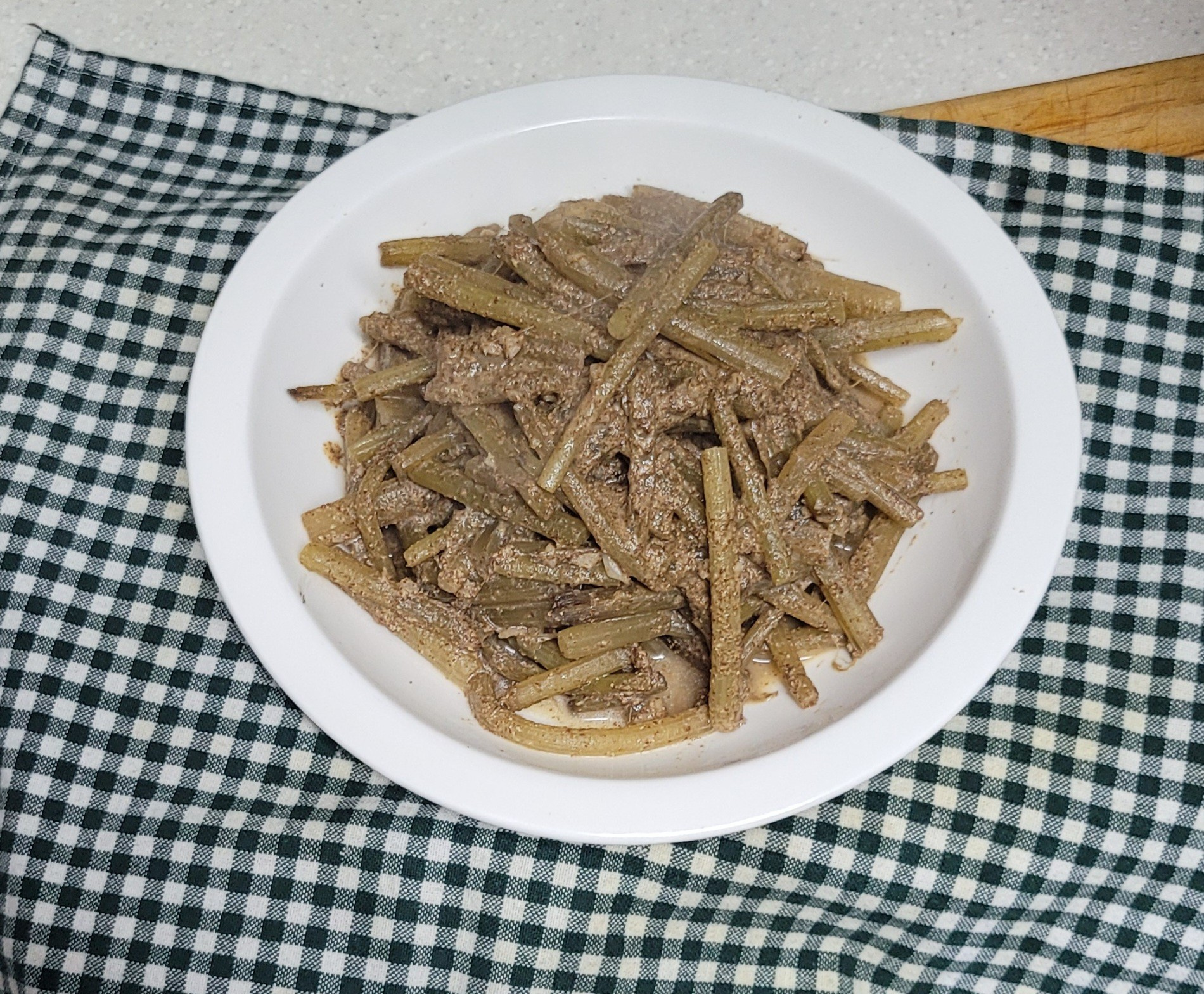 Una vez que los sabores se hayan mezclado y los tallos de Petasites estén tiernos y bien cocidos, apaga el fuego. Transfiere los deliciosos tallos de Petasites salteados a un plato de servir. ¡Disfruta de este maravilloso plato con un tazón de arroz caliente!