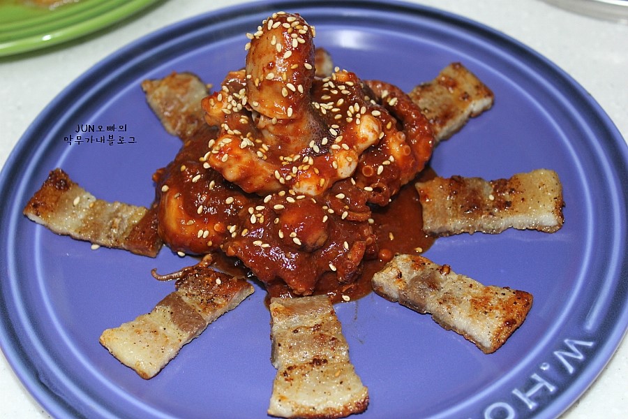 Corte la panceta de cerdo cocida en trozos del tamaño de un bocado y colóquelos en un plato para servir. Luego, agregue con cuidado el pulpo salteado bien cocido junto a la panceta de cerdo. ¡Felicidades, su sabroso y vibrante salteado de pulpo bebé y panceta de cerdo (comúnmente llamado ‘Jjo-Sam’) está completo! Disfrute de este delicioso plato.