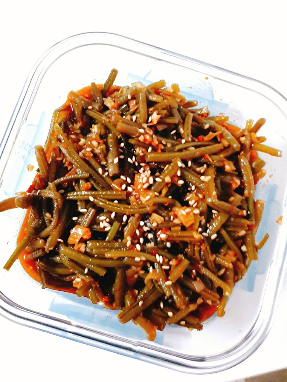 En un bol, combina los tallos de batata preparados, la cebolleta finamente picada y todos los ingredientes del condimento (ajo picado, salsa de soja, salsa de pescado, gochugaru, oligodang). Mezcla suavemente con las manos hasta que el condimento esté uniformemente distribuido. Evita mezclar en exceso para mantener los tallos intactos.