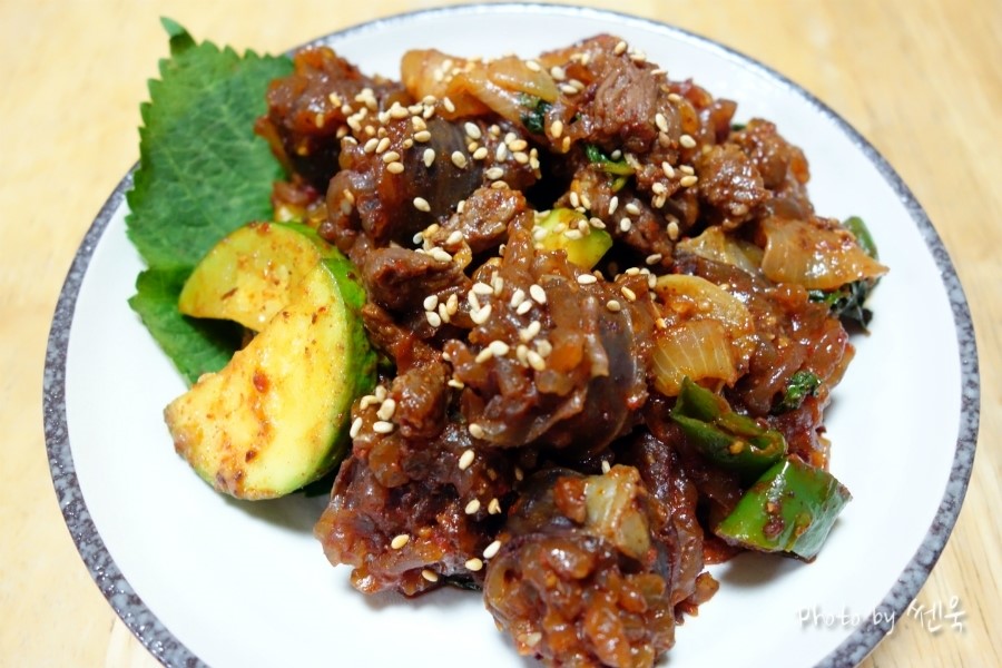 Una vez que el ajo y el calabacín estén parcialmente cocidos, añade el sundae, la ternera cortada en láminas finas y los chiles Cheongyang cortados en diagonal. Saltea todo junto. Cuando los ingredientes comiencen a cocinarse ligeramente, vierte toda la salsa preparada. Añade 3 vasitos pequeños de soju de agua (aproximadamente 150 ml). Remueve y cocina a fuego medio-bajo, asegurándote de que los ingredientes no se quemen y la salsa los cubra uniformemente.