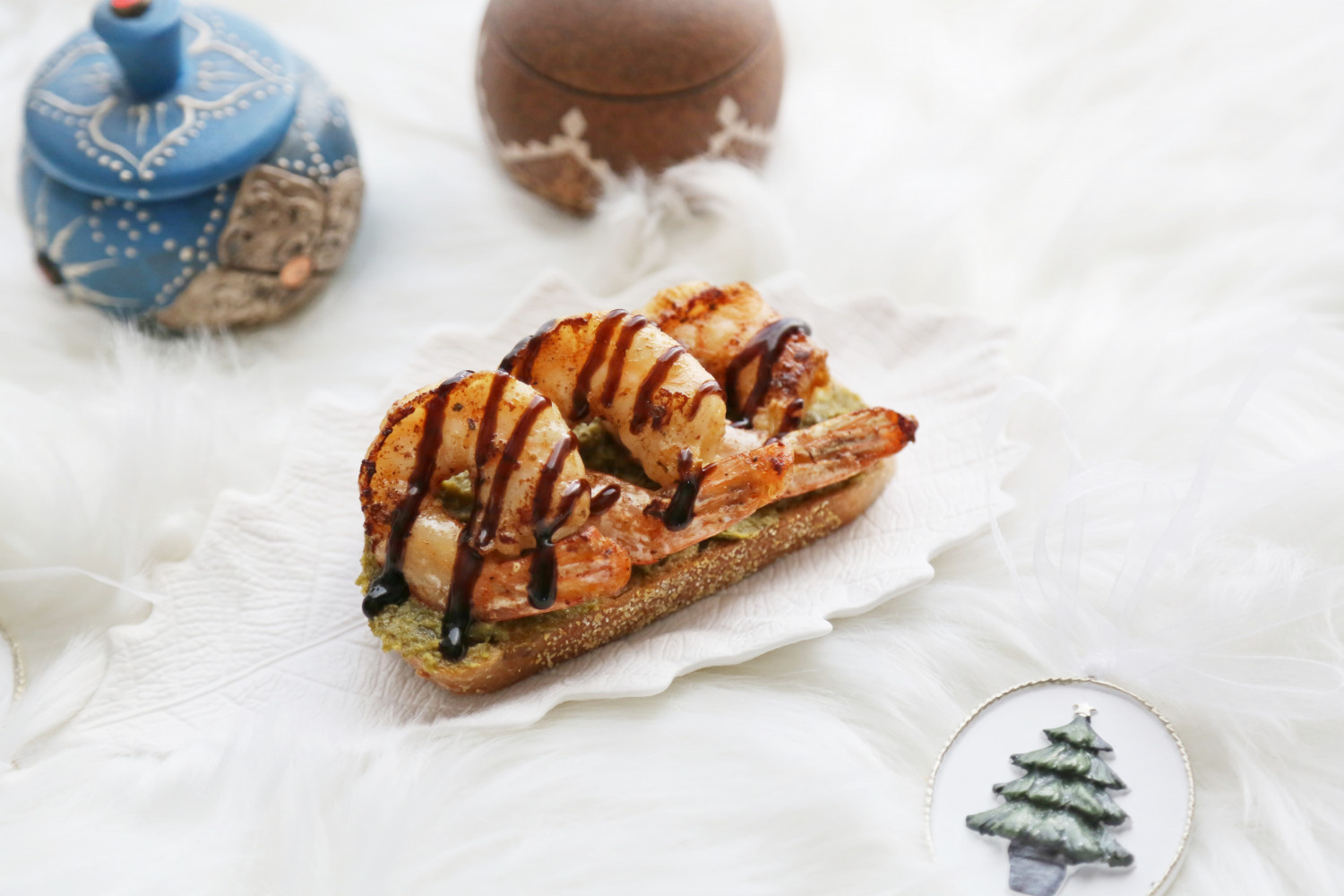Sándwich Abierto de Camarones con Pesto y Balsámico
