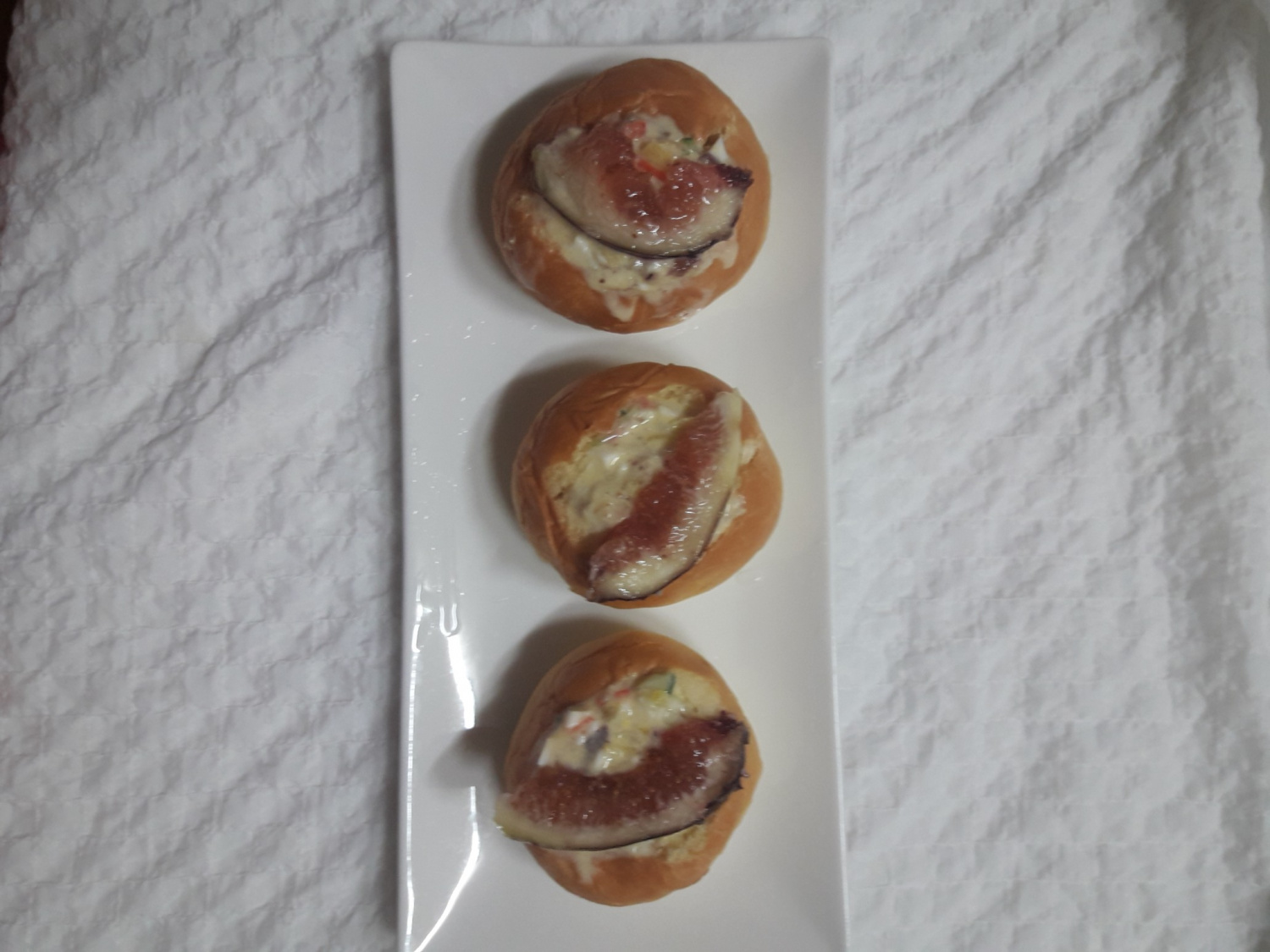Rellene generosamente los panes de mañana ahuecados con la mezcla de higo y huevo preparada. Vuelva a colocar las tapas cortadas para completar sus deliciosos Sándwiches de Pan de Mañana con Higo. ¡Disfrútelos inmediatamente para obtener la mejor textura y sabor!