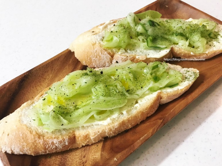 Rocía aceite de oliva virgen extra sobre las rodajas de pepino en un patrón de zigzag. El aceite de oliva realza el sabor fresco del pepino y añade un toque de riqueza.