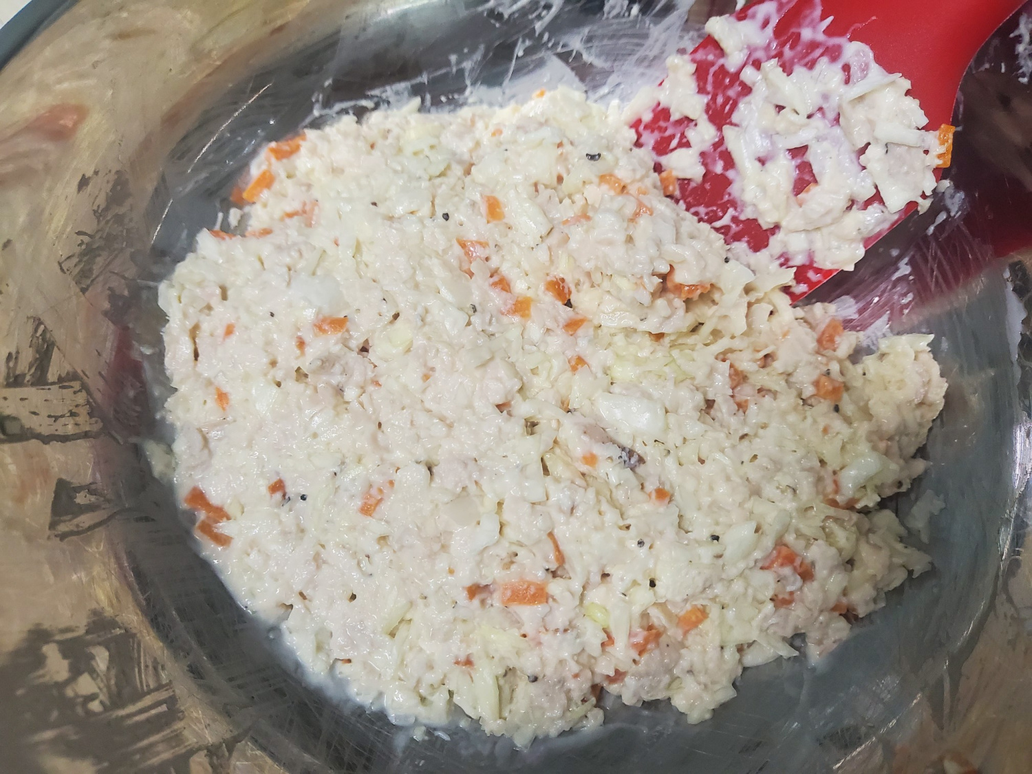 Vierte el aderezo preparado sobre la mezcla de pechuga de pollo, repollo y zanahoria enfriada en el bol. Usa una cuchara o espátula para mezclar todo bien, asegurándote de que no queden grumos. Remueve suavemente hasta que el aderezo cubra uniformemente todos los ingredientes. ¡Tu sabroso relleno de ensalada de pollo está listo!