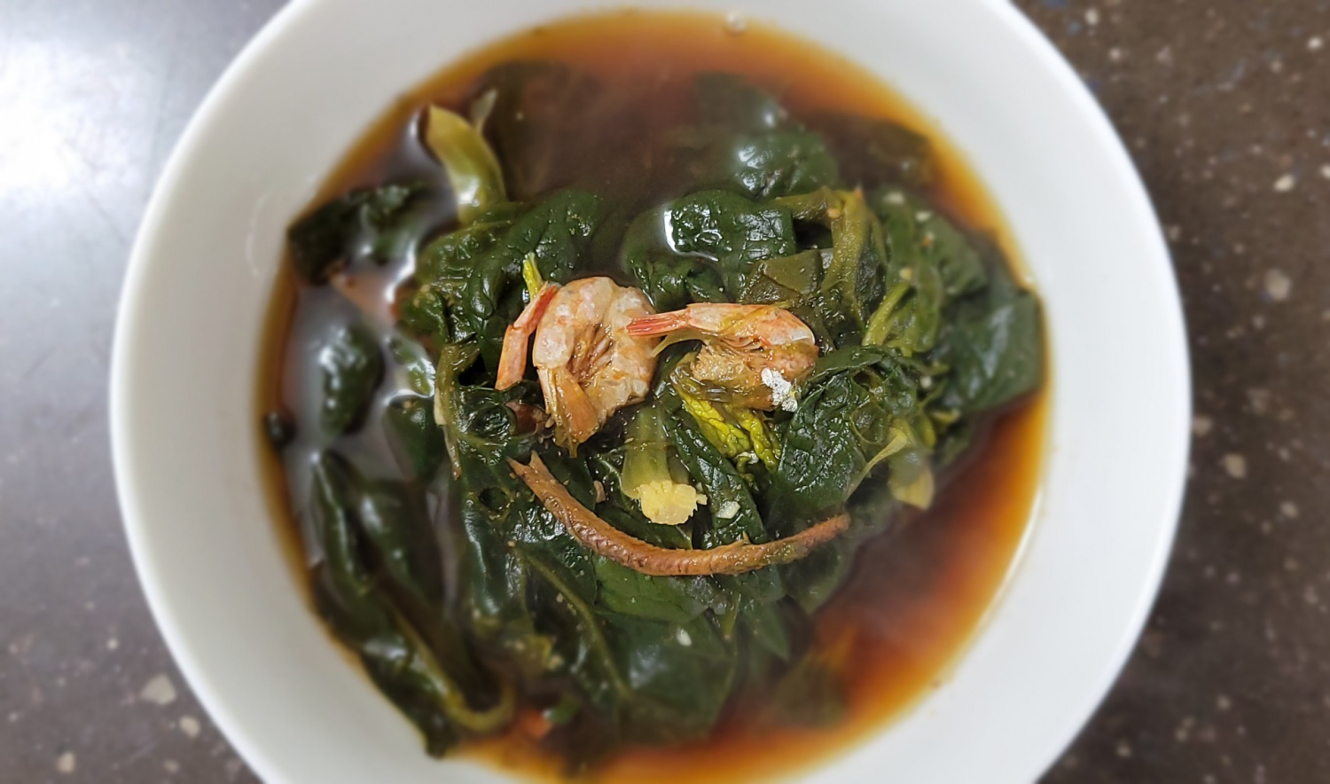 Añada las espinacas limpias y cortadas (100g) y 10 gambas secas al caldo de anchoas preparado. (Si tiene espinacas precocidas, también puede usarlas. En ese caso, asegúrese de escurrir el exceso de agua antes de añadirlas.)