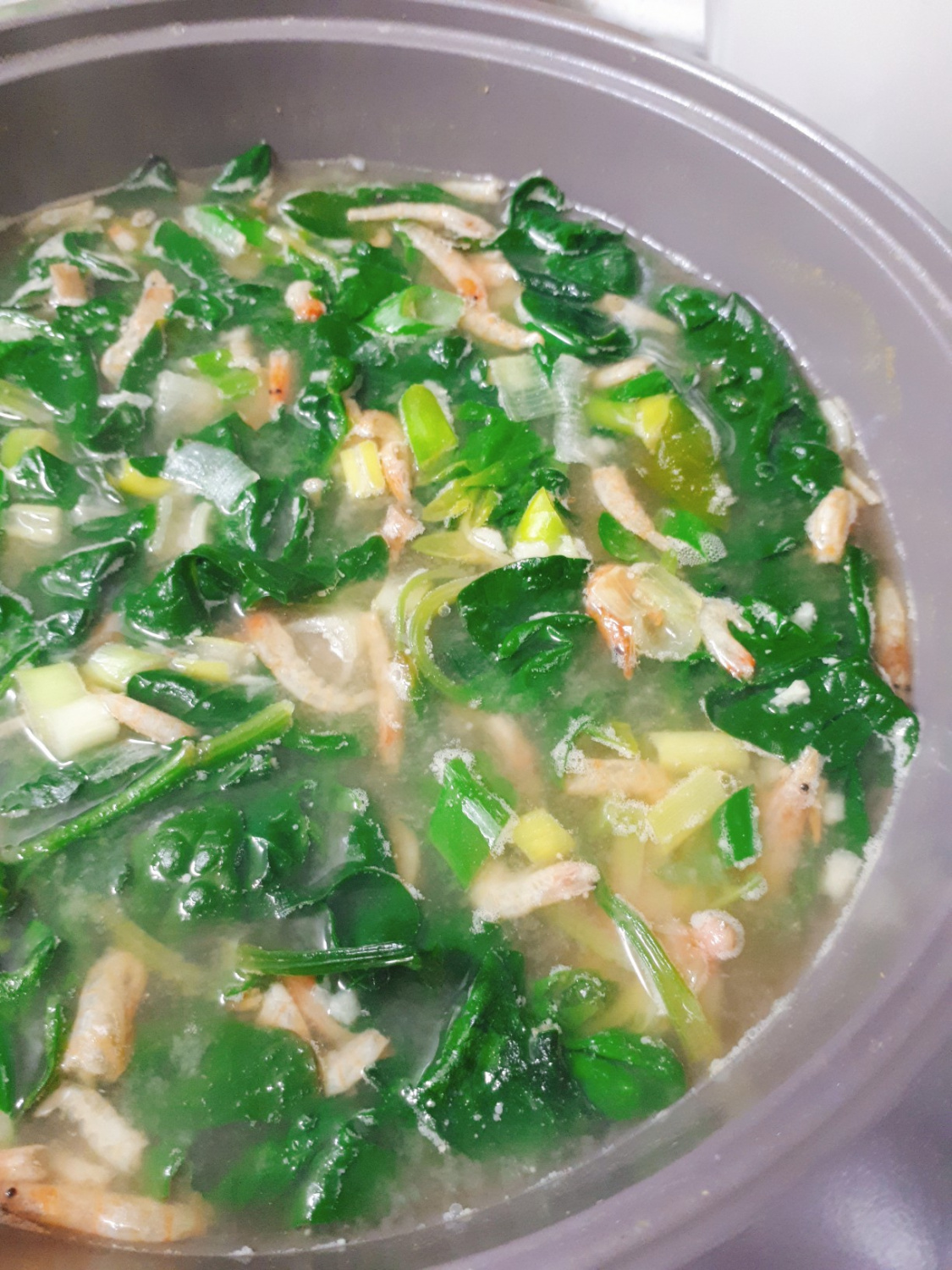 Añada las espinacas limpias al caldo. Luego, agregue los camarones secos pequeños y el ajo picado. Sazone con una pizca de pimienta negra, si lo desea. Una vez añadidas las espinacas, reduzca el fuego a medio-bajo. Tenga cuidado ya que la sopa de miso puede hervir fácilmente.